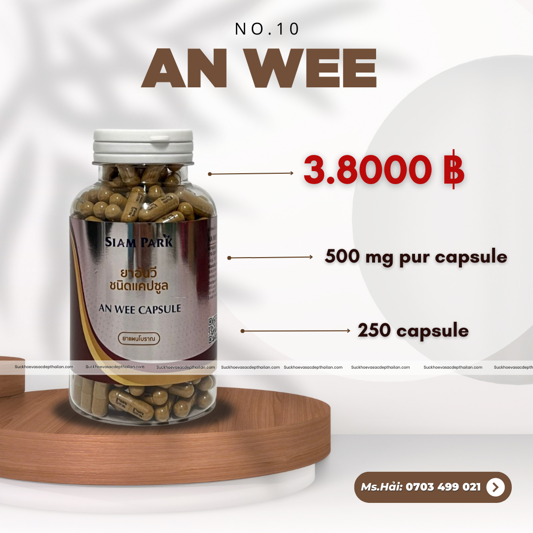 An Wee Capsule là một giải pháp độc đáo được sản xuất tại Trung tâm Siam Park, Thái Lan. Sản phẩm này chứa các thành phần quý giá, được kết hợp tinh tế, để đảm bảo rằng nó có khả năng mang lại tác dụng với một số loại bệnh phức tạp. Đây là một sản phẩm hoàn toàn tự nhiên và an toàn, được chế tạo từ mật của rắn hổ mang chúa cùng với các loại thảo dược khác, có khả năng điều trị các loại bệnh liên quan đến đường tiêu hoá như bao tử, dạ dày, tá tràng.